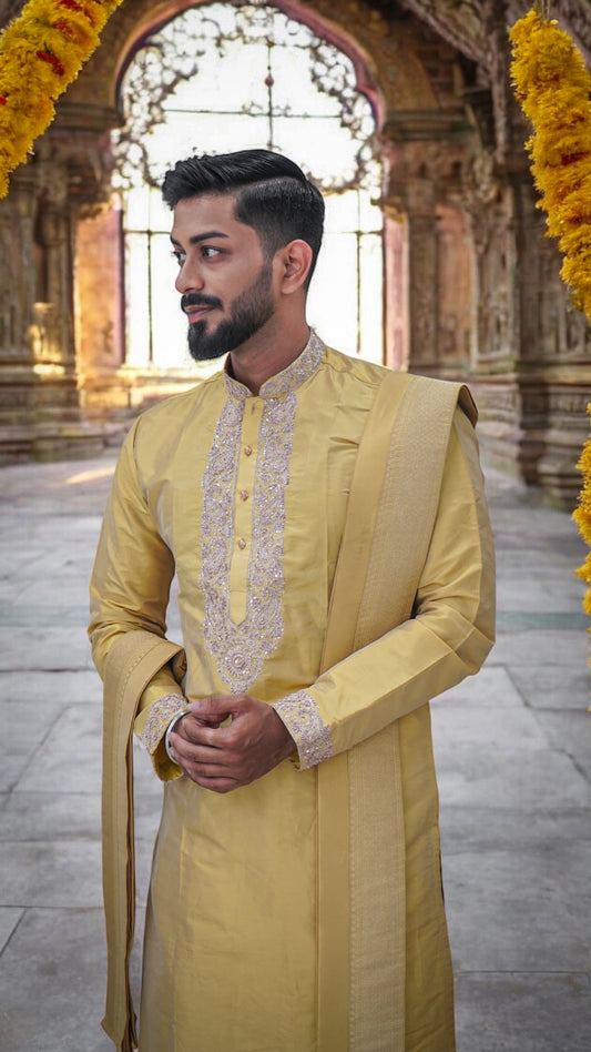 Heritage Pattu Kurta Pancha – Mustard Gold