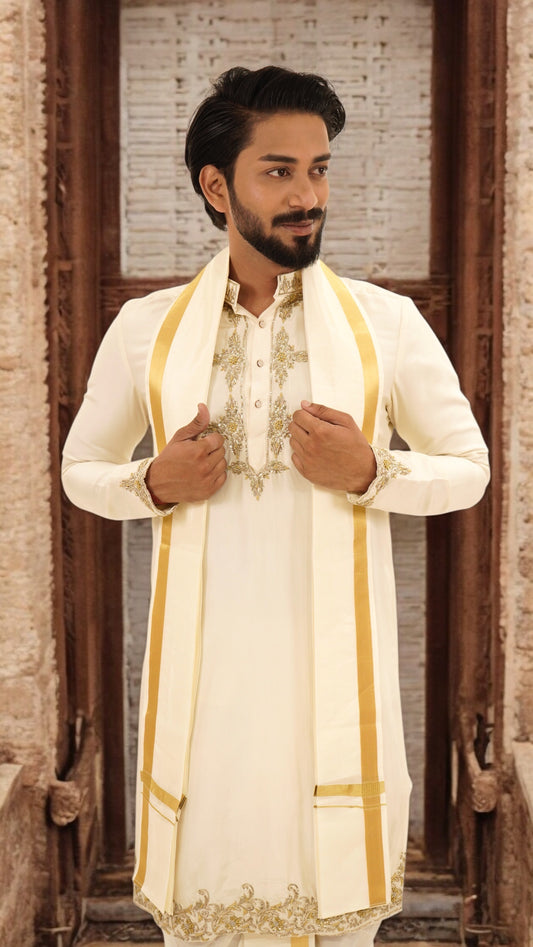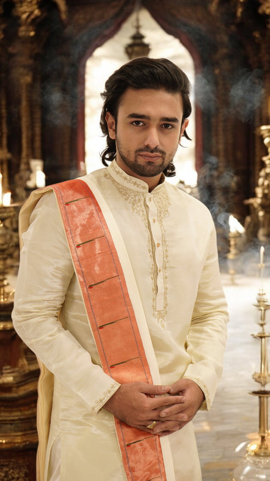 Cream Heavy all Over Embroidered Pure Pattu Kurta-Set