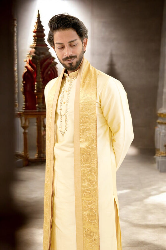 Yellow Cream all Over Embroided Pure Pattu Kurta Set