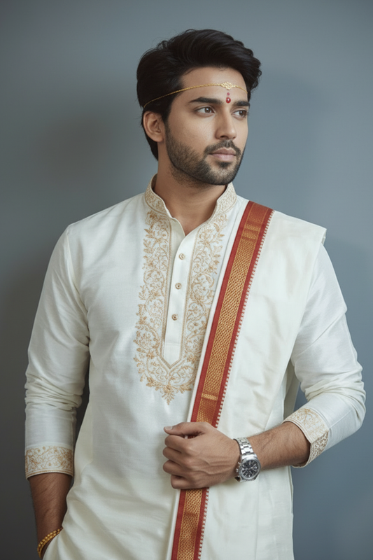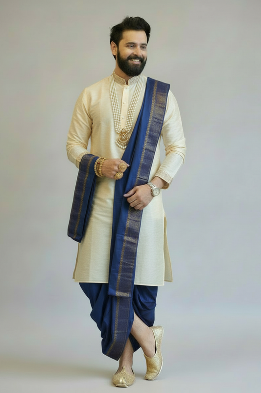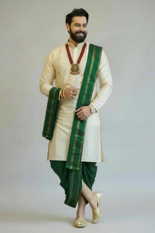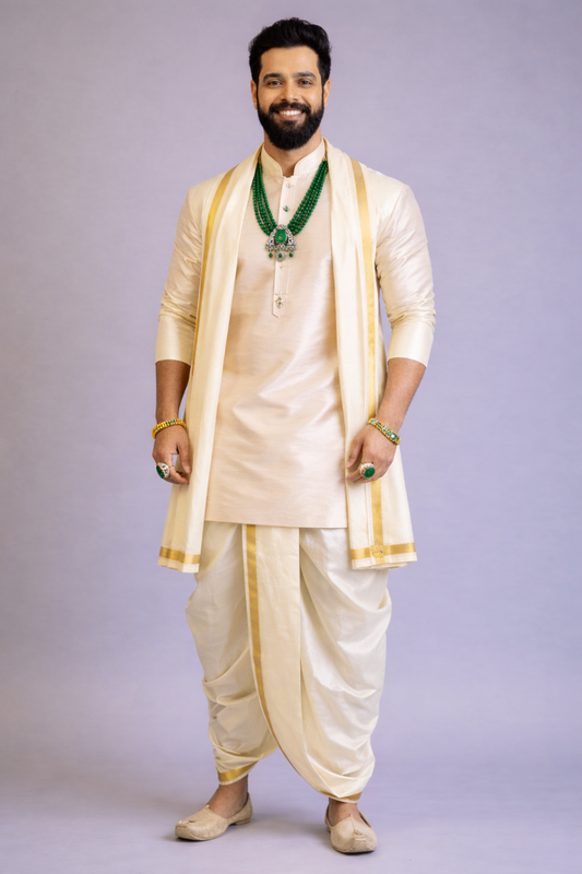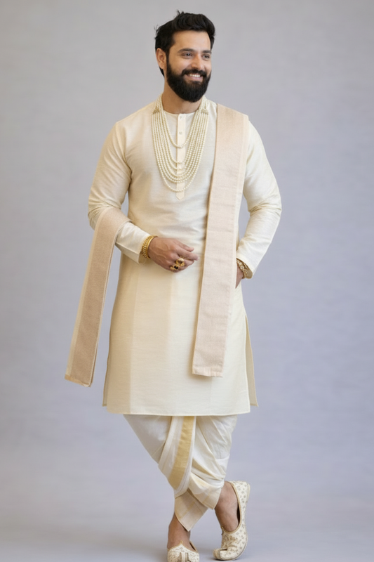 Cream Traditional Kurta Dhoti Set for Men – South Indian Wedding Outfit
