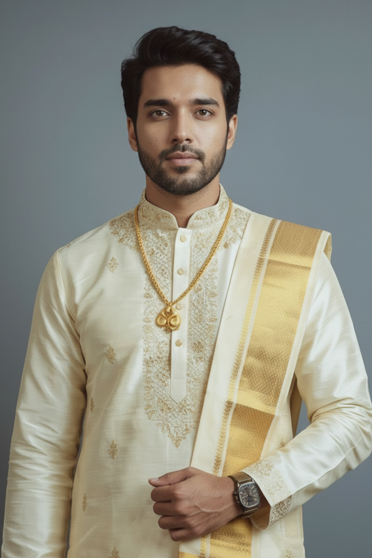 Men’s Traditional Cream Kurta Dhoti Set with Gold Border stole – South Indian Wedding Ethnic Wear