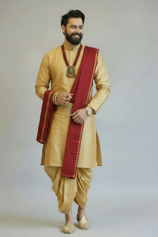Men’s Traditional Gold Dhoti Kurta Set with Red Angavastram | South Indian Wedding Ethnic Wear