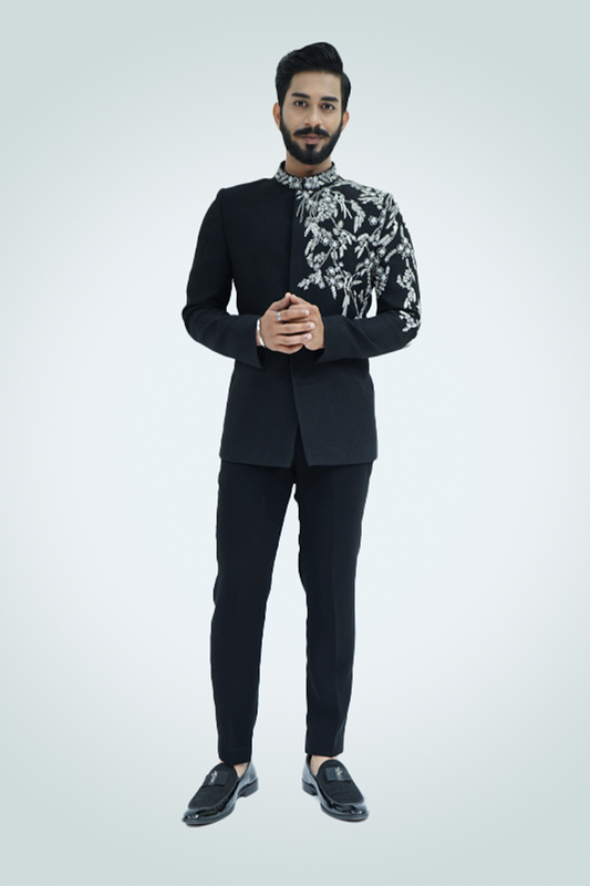 Italian Shimma Wool Crepe Black Silver Maggam Embroidered Jodhpuri