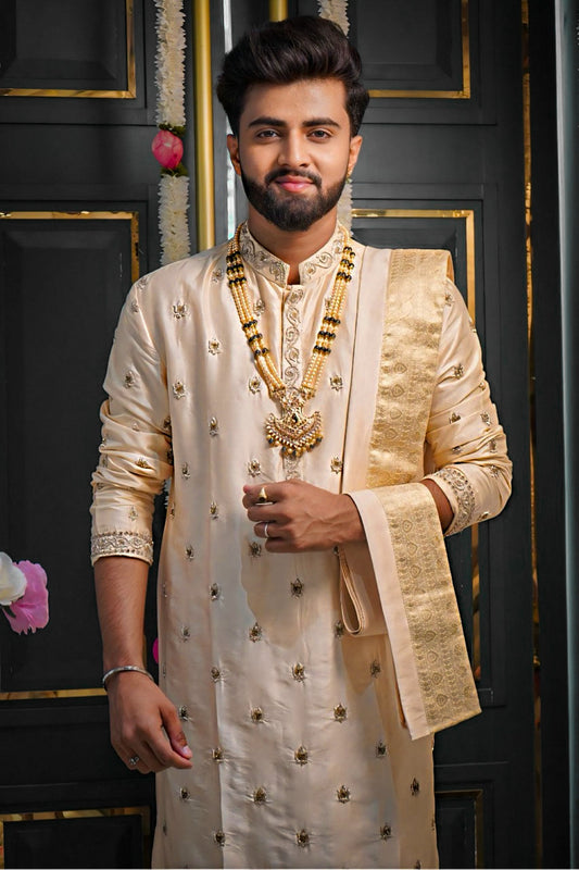 Beige gold pure Pattu Pancha set with detailed zardosi work