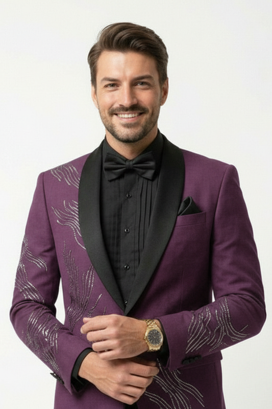 Plum Purple Shawl Lapel Embellished Tuxedo