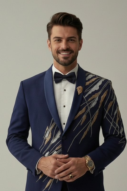 Diagonal embroidered ink blue tuxedo with trouser