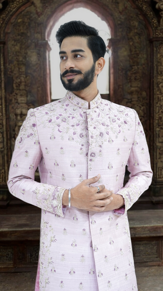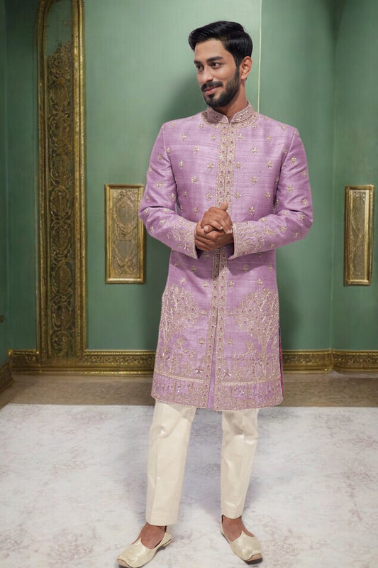 Plum Pure Raw Silk Sherwani Set With Floral Intricate Zardosi Work.