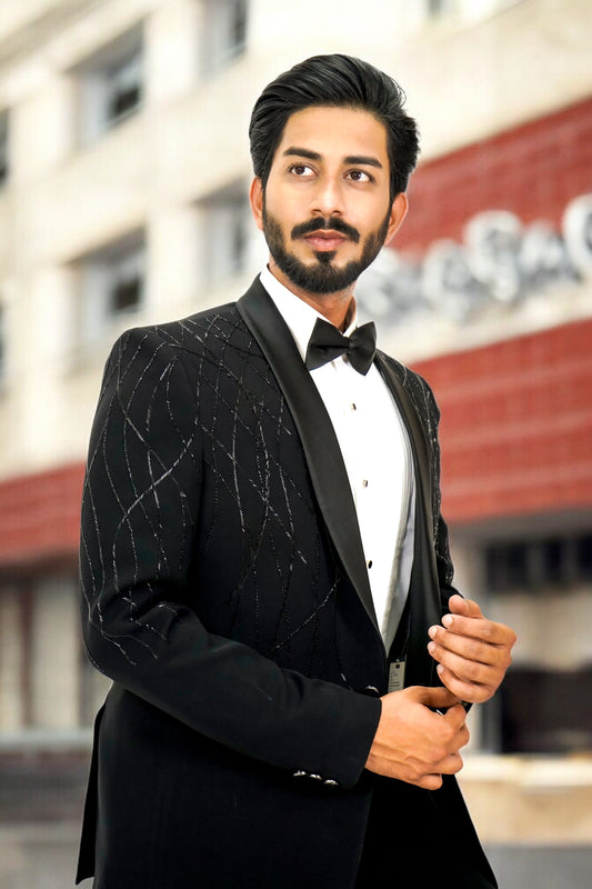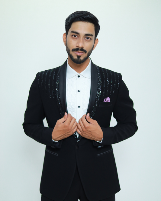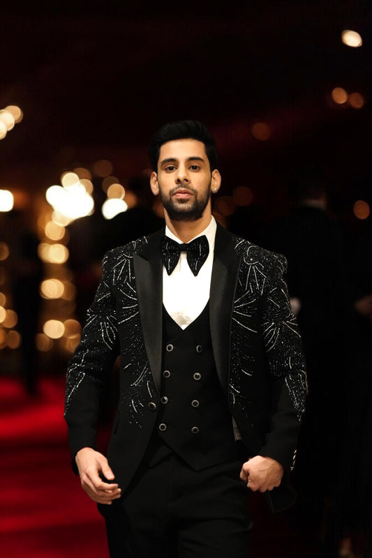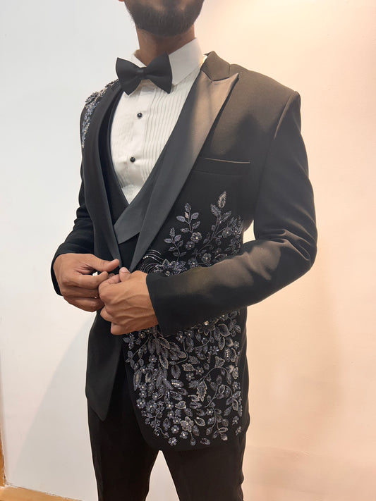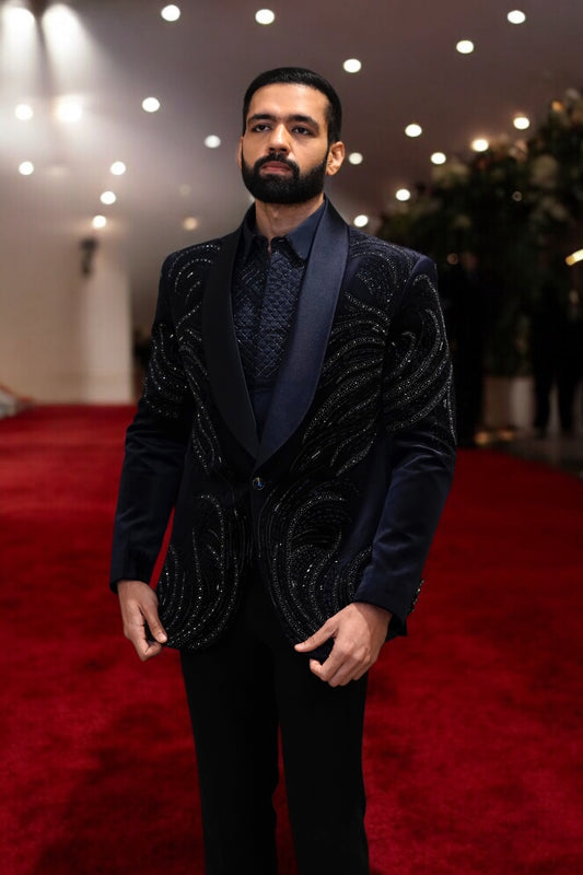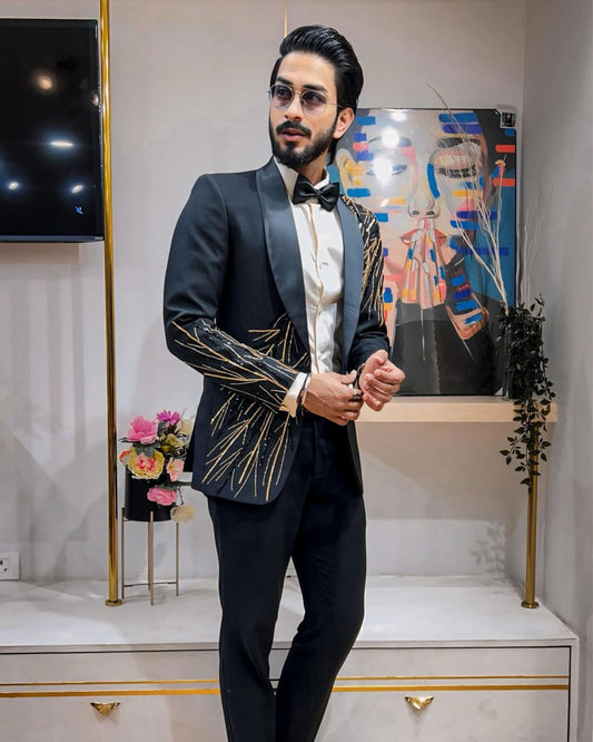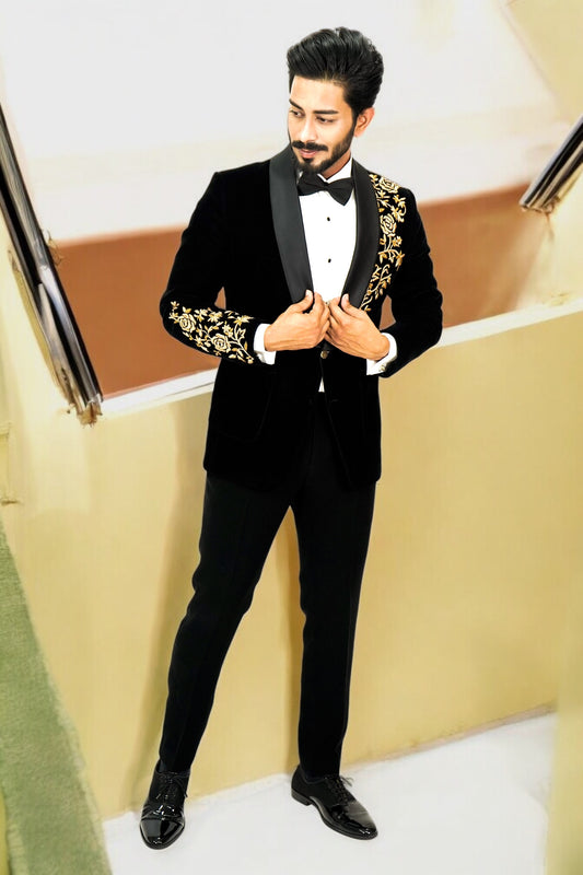 Black Velvet 2 piece Tuxedo with golden zardosi embroidery