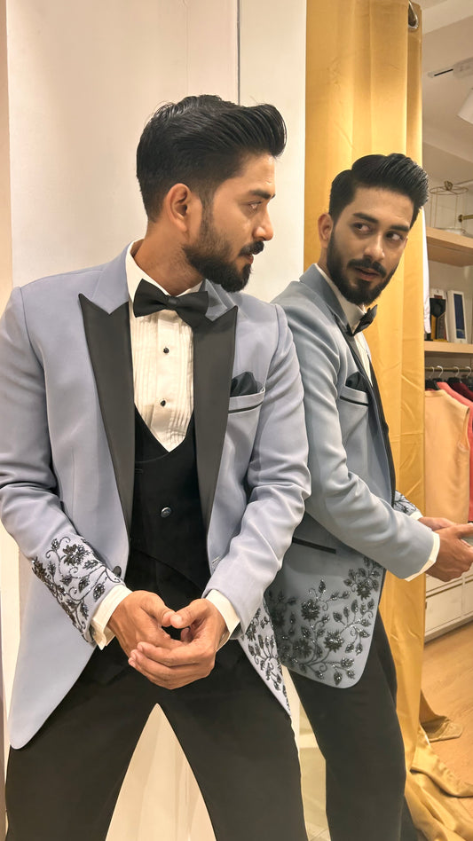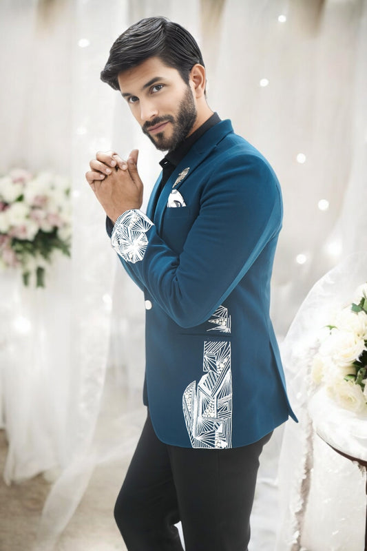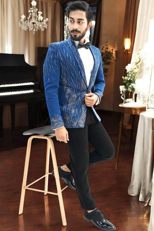Persian Blue Wool Crepe 2-Piece Tuxedo with Cutdana Work
