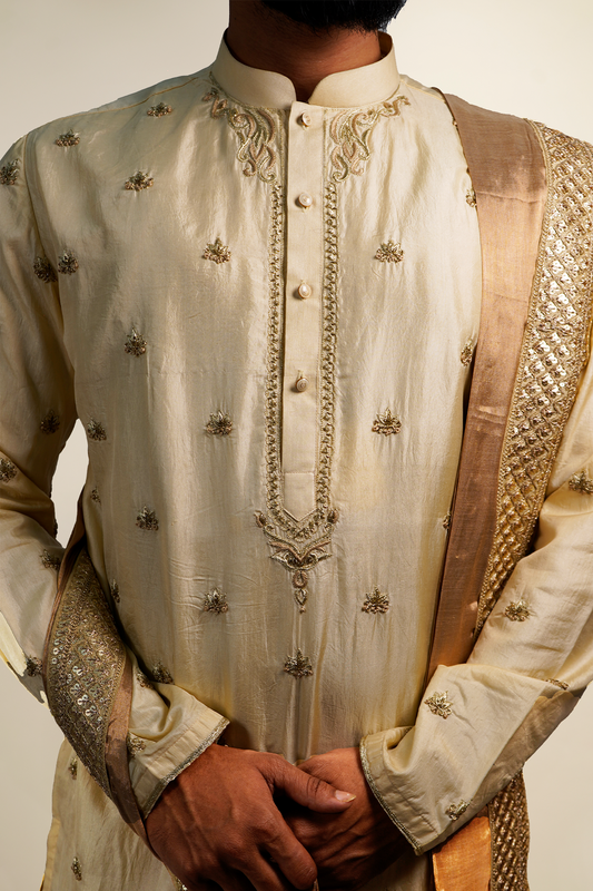 Light Cream Textured Pattu Pancha Kurta with Zardozi Work