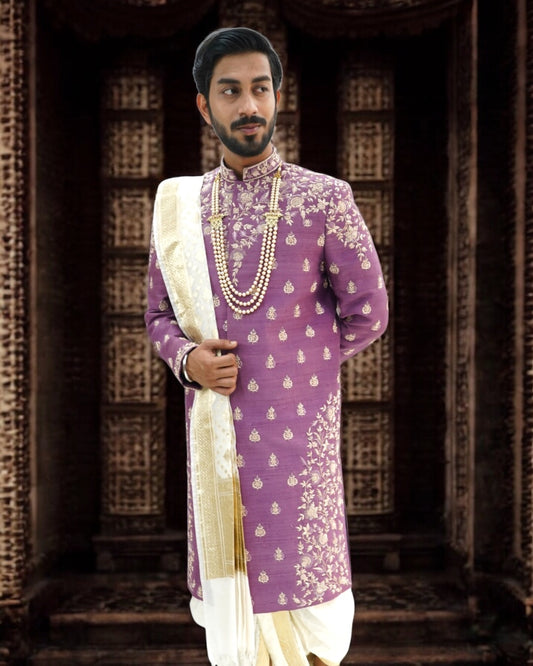 Plum Pure Raw Silk Sherwani Set With Floral Intricate Zardosi Work.