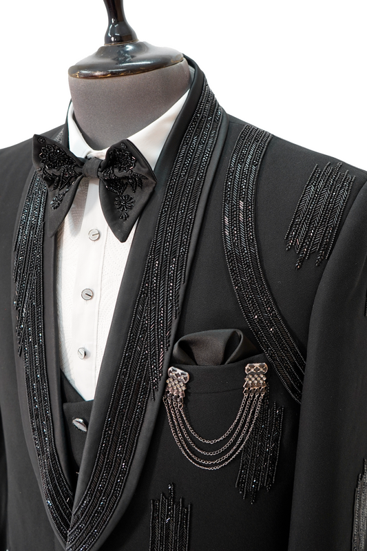 Black Italian Woolcrepe 2-piece tuxedo with lapel and shoulder Embroidery