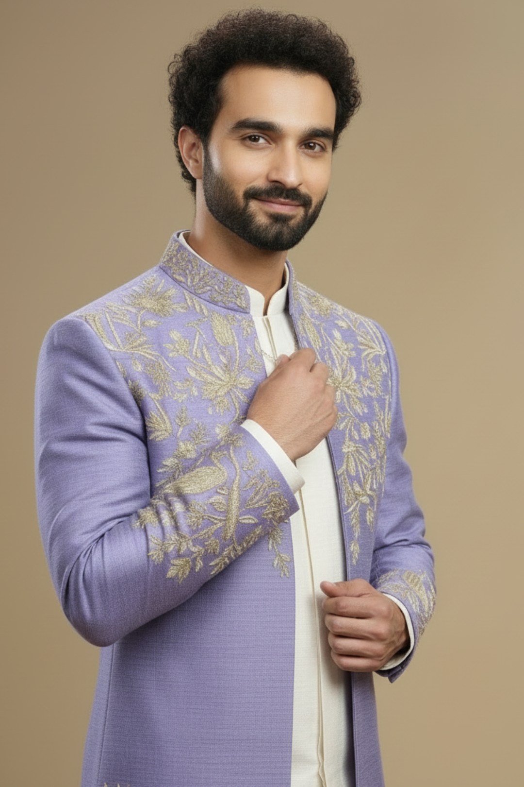 The soothing lavender base is beautifully adorned with delicate gold floral embroidery across the body and sleeves, creating a refined and regal look. Made from premium-quality fabric, the sherwani offers a structured yet comfortable fit, ideal for long celebrations. The pastel shade adds a contemporary charm, making it perfect for daytime weddings and sophisticated evening events alike.