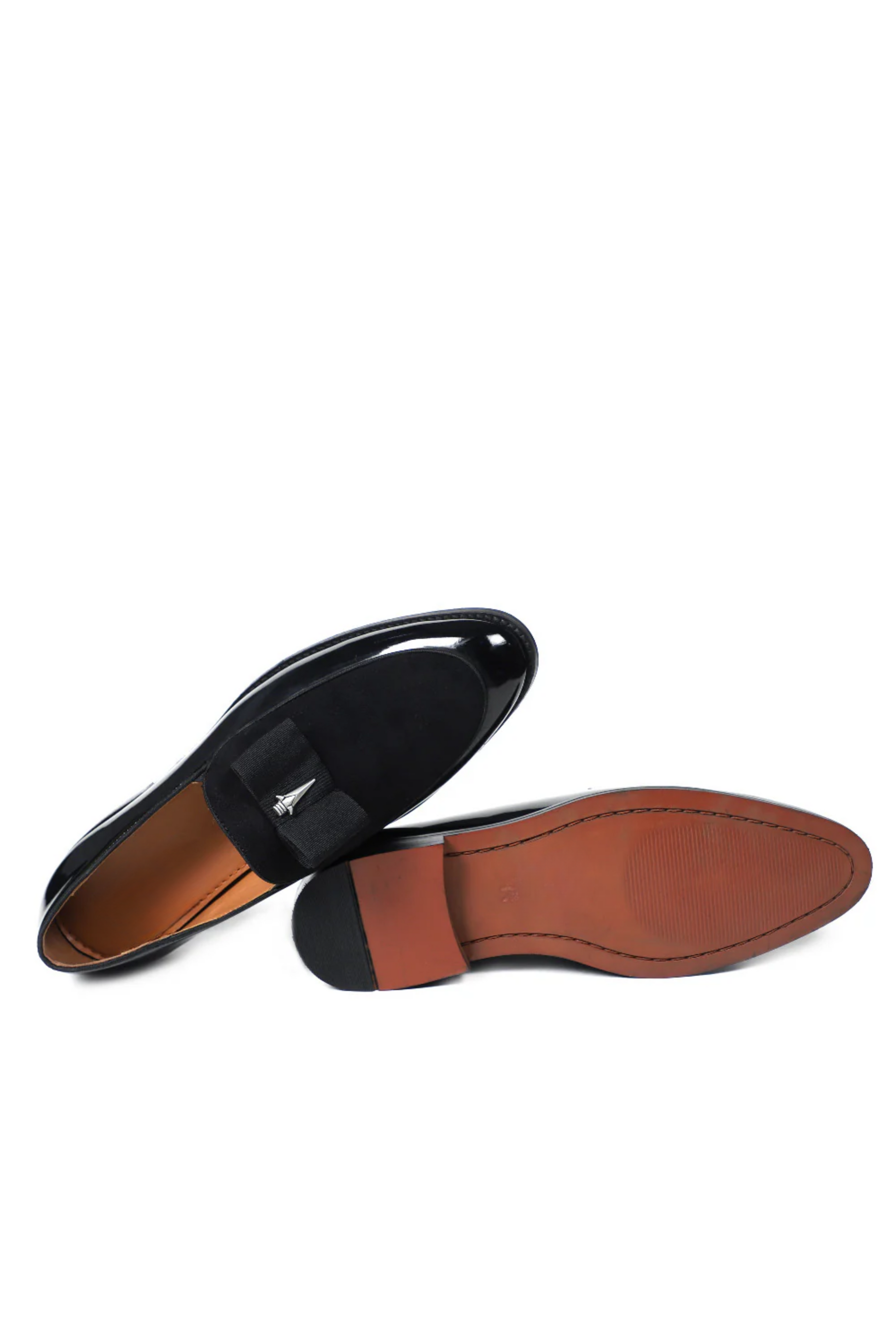 Featuring a chic brooch detail positioned atop a deep, glossy black patent upper, these loafers deliver a polished, eye-catching aesthetic. -